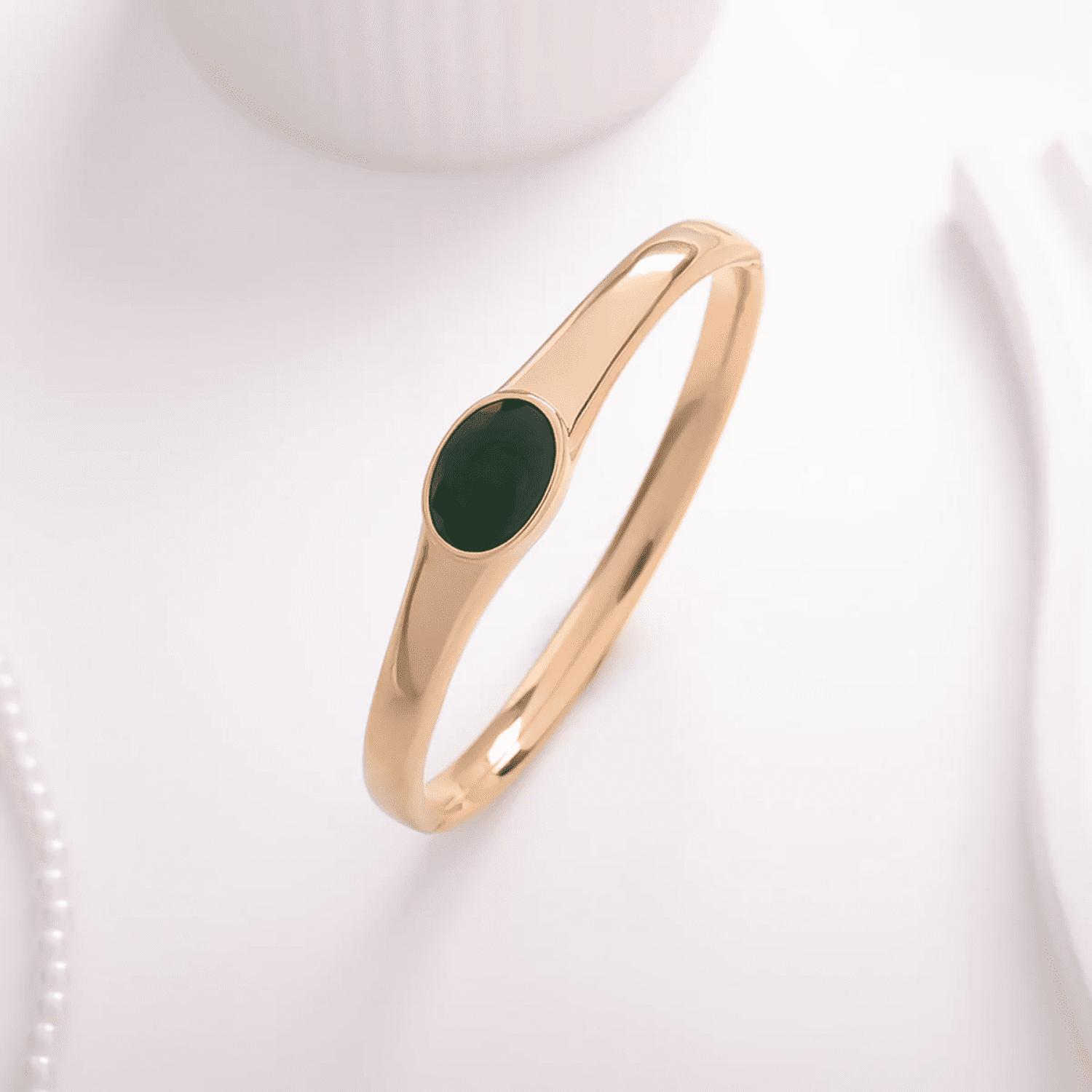 Crafted with attention to detail, this bracelet offers a comfortable fit and a touch of refined glamour. The smooth, gold-plated surface catches the light, enhancing the rich green hue of the central stone. Its classic bangle style ensures easy wear and a secure fit, making it ideal for both everyday elegance and special occasions.