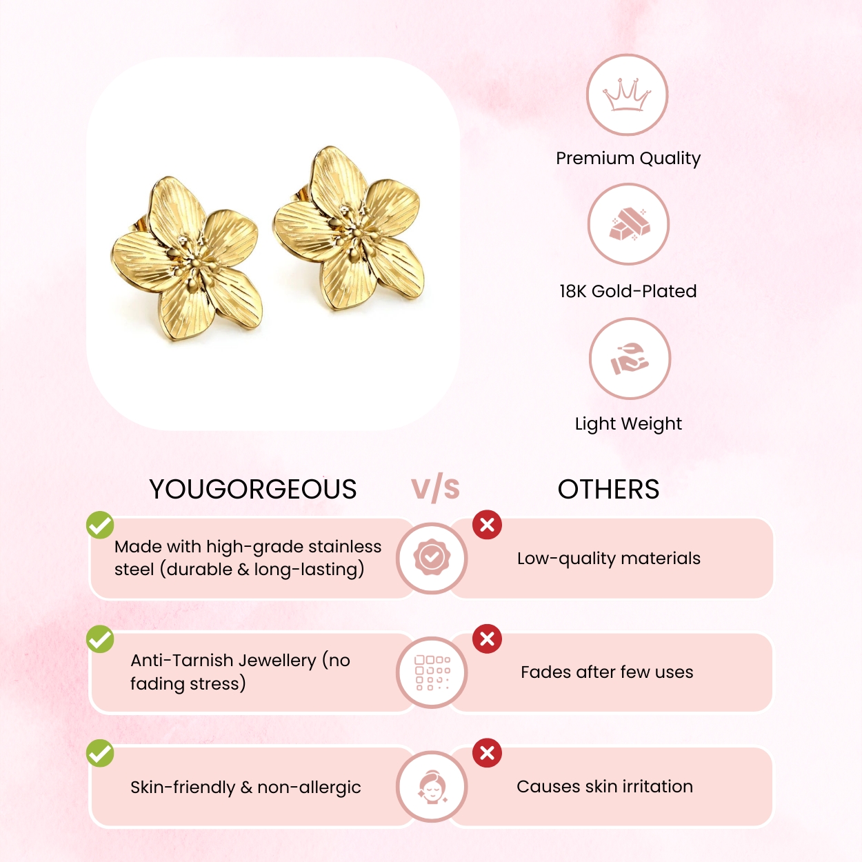 At YouGorgeous™, we combine design with durability. These earrings are crafted from premium 316L surgical-grade stainless steel and finished with advanced 18K Gold PVD plating, ensuring long-lasting shine and resistance to fading.