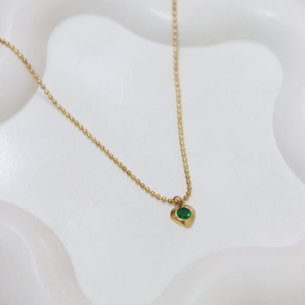 The heart pendant, meticulously crafted with a polished finish, is plated in 18k gold, creating a warm and elegant contrast to the emerald’s vibrant green. The combination of the heart shape and the emerald gemstone symbolizes love, renewal, and good fortune.