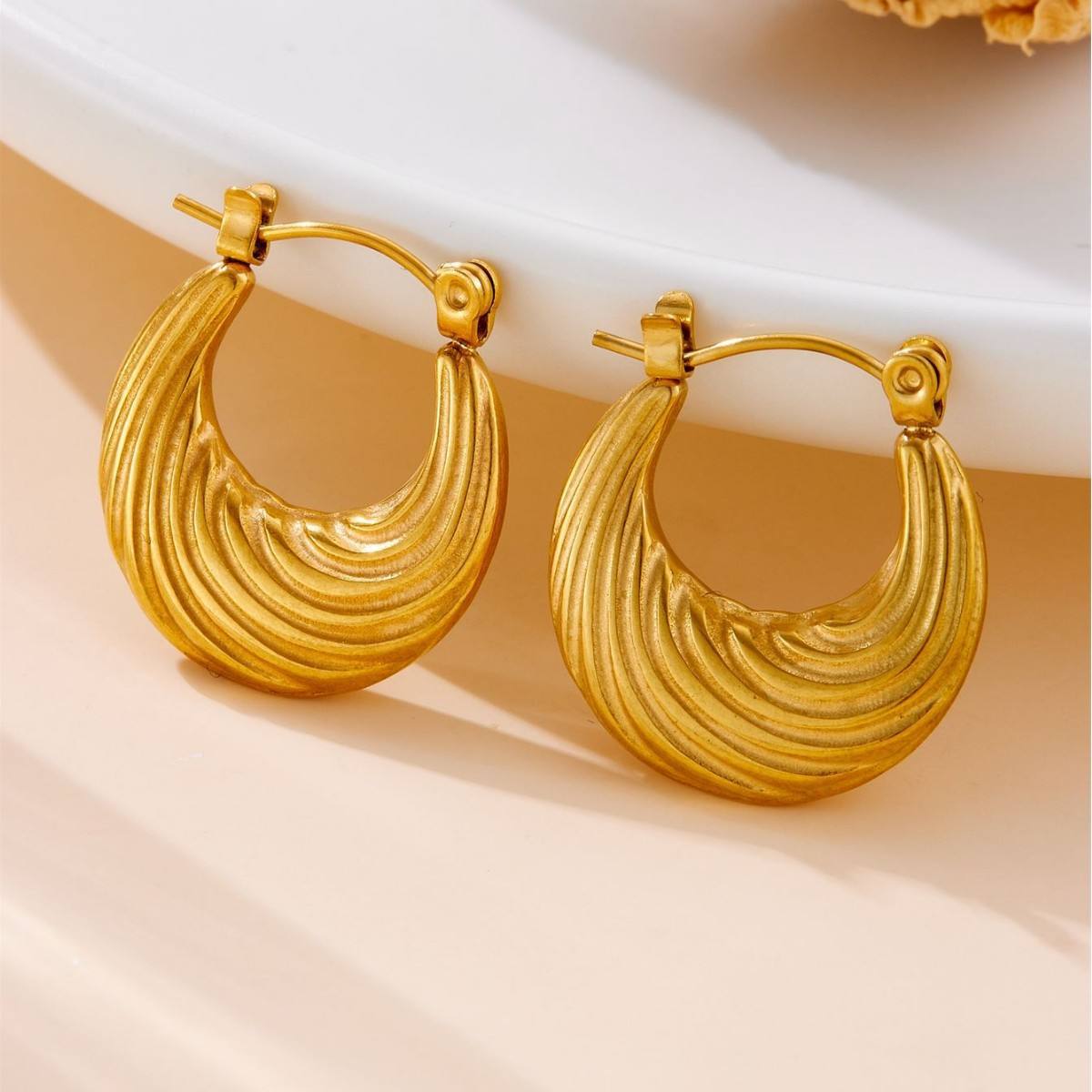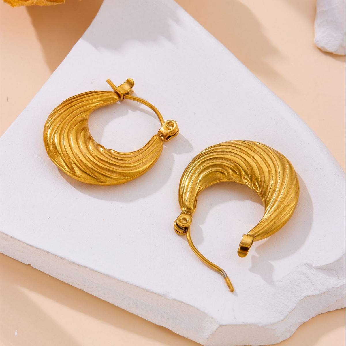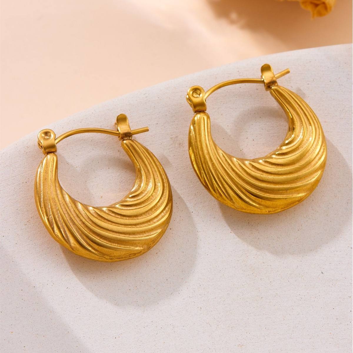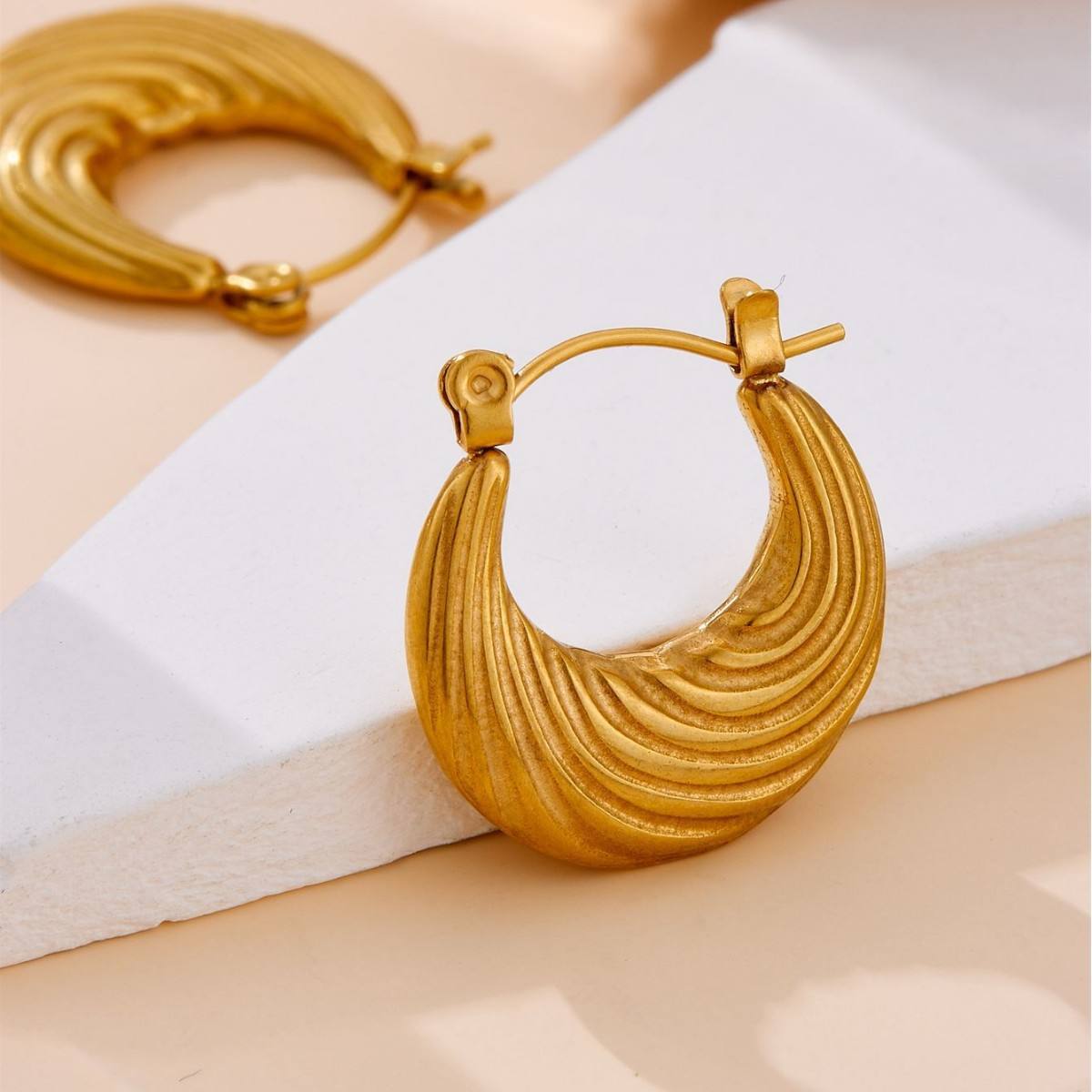The standout element lies in its rich ribbed wave texture, creating a dynamic play of light and shadow that enhances depth and dimension. The sculptural design delivers a perfect balance of minimalism and statement, making these hoops ideal for both everyday styling and elevated occasions.