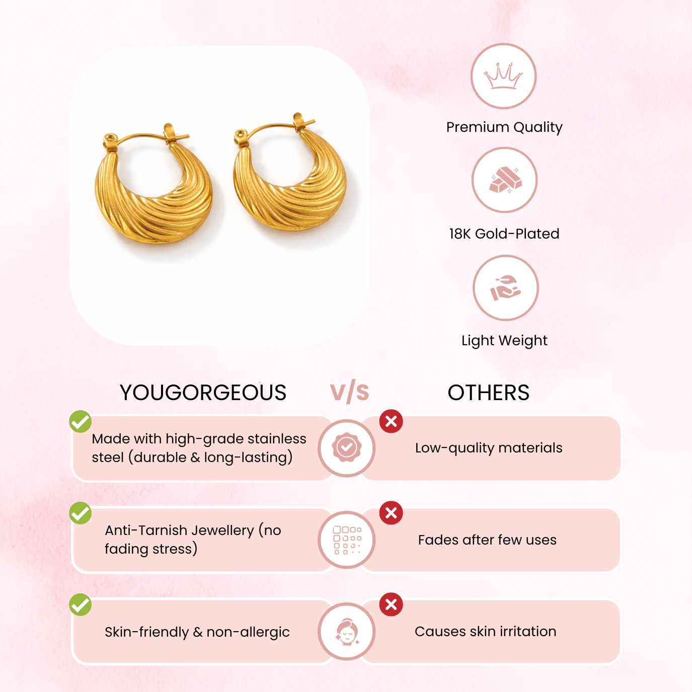 At YouGorgeous™, elegance meets durability. Crafted from premium 316L surgical-grade stainless steel and finished with advanced 18K Gold PVD plating, these earrings are built to last.