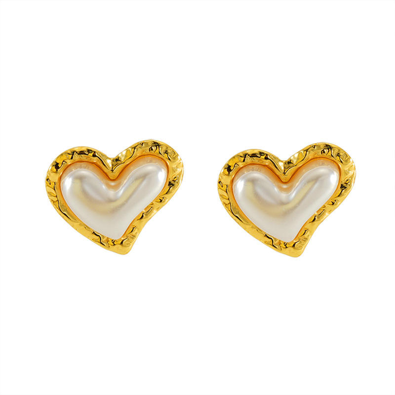 Earring Style Heart Pearl Stud / Irregular Hammered Border
