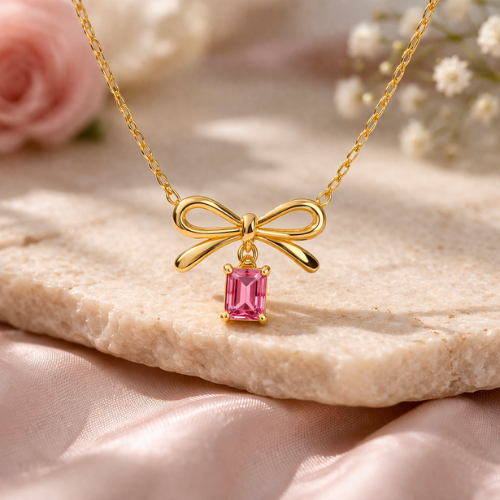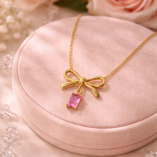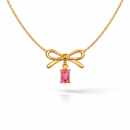 Embrace the charm of the season with the YouGorgeous™ Pink Zirconia Bow Necklace. This dainty masterpiece features a perfectly sculpted golden ribbon bow, from which dangles a vibrant, emerald-cut pink zirconia stone. The combination of the feminine bow motif and the regal pink gemstone creates a sophisticated “balletcore” look that is both playful and luxurious. It’s the ideal piece to add a pop of romantic color to your daily style or to complete a polished evening ensemble.